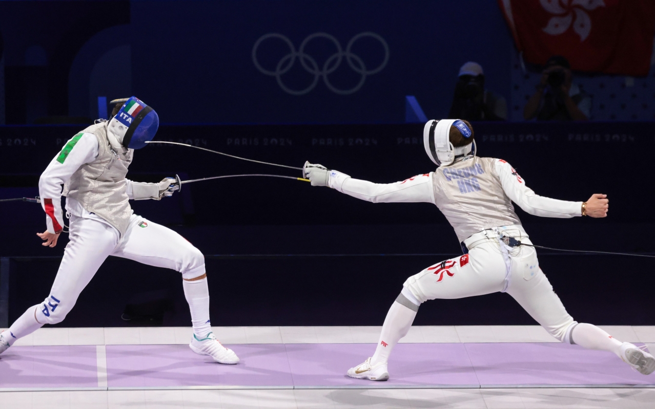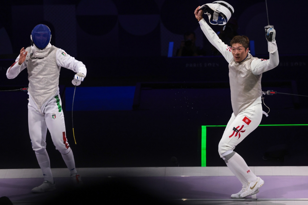 中國香港選手張家朗(右)15比14戰勝意大利選手菲利波·馬基,奪得冠軍