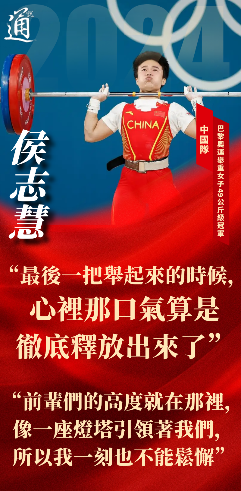 (香港新聞網製圖) 與李發彬波瀾不驚的衛冕之路不同,侯志慧的摘金過程上演了一出絕地反擊。 決賽中,侯志慧抓舉階段發揮失常,僅舉起89公斤,與第一的羅馬尼亞選手坎貝伊相差四公斤;挺舉對決中,面對坎貝伊三次試舉成功,侯志慧背水一戰,在最後一舉挺舉117公斤成功,總成績以1公斤的優勢險超坎貝伊,逆轉奪冠。 最後一舉成功後,侯志慧緊握拳頭咆哮了幾聲。“這口氣憋得實在太久,最後一把舉起來的時候,心裡那口氣算是徹底釋放出來了。”她說。 從東京到巴黎,侯志慧少了些“逆天改命”的決絕,多了些久經沙場的沉穩。談及第二次征戰奧運會的感受時,她眼含淚光。“這個級別一直是中國隊的強項,前輩們的高度就在那裡,像一座燈塔引領著我們,所以我一刻也不能鬆懈。”