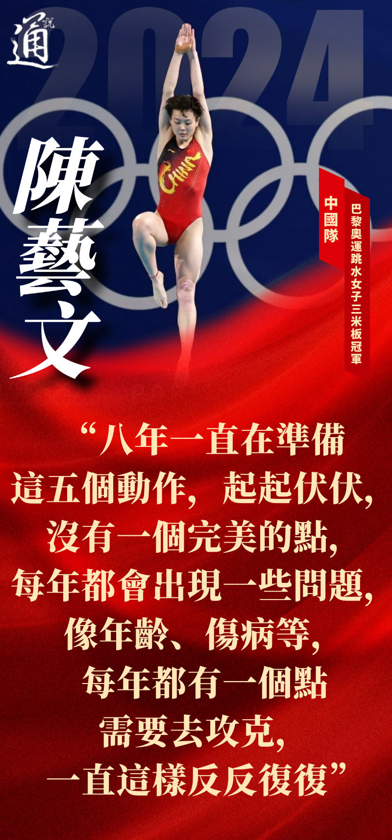 (香港新聞網製圖) 馬龍告別了奧運,但沒有告別職業生涯。“這枚金牌是結束我奧運之旅的絕佳方式,但將來你們仍有可能在國際舞台上見到我。”他稱希望像德國乒壇老將波爾一樣,“去影響更多的小朋友喜歡上乒乓球。” 當日,中國跳水隊亦再奏凱歌。陳藝文摘得跳水女子3米板金牌,幫助中國隊實現在該項目的奧運十連冠。 奪金後的陳藝文微笑著擁抱了教練,“我以為自己會哭,但最後還是很平靜。”這次決賽的表現是陳藝文預料到的,結果也是水到渠成。 從東京周期到巴黎周期,陳藝文用八年時間精雕細琢決賽的五個動作,與種種困難做對抗。“八年一直在準備這五個動作,起起伏伏,沒有一個完美的點,每年都會出現一些問題,像年齡、傷病等,每年都有一個點需要去攻克,一直這樣反反復復。”