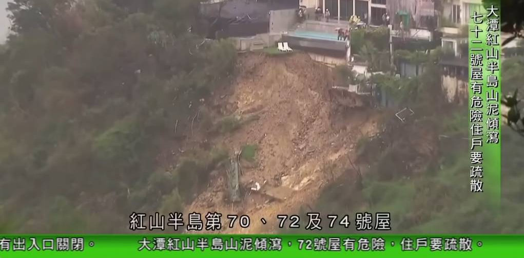 通說:暴雨揭露這個“風土病” 香港開刀了!一場世紀暴雨意外衝出一樁最近全港都在關注的事件——香港紅山半島豪宅涉嫌違建。 9月7日晚,香港遭遇世紀大暴雨,雨水衝刷下,豪宅小區紅山半島發生山泥傾瀉,小區內70號、72號及74號三間獨棟豪宅露出真容。照片顯示,三間豪宅的地基均曝露在懸崖邊,其中以72號豪宅的情況最為嚴重,泳池懸吊半空,缺乏泥土支撐,存在崩塌風險。