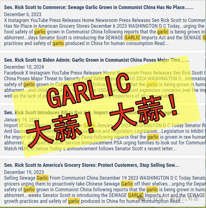 這可不是個例。就在法案在眾議院通過的前一天,美國佛羅里達州共和黨籍參議員里克·斯科特(Rick Scott)的辦公室剛剛發布了一份聲明。聲稱中稱,中國種植的大蒜對美國的食品安全構成“極大威脅”,希望多個聯邦機構能夠調查美國進口的中國大蒜。