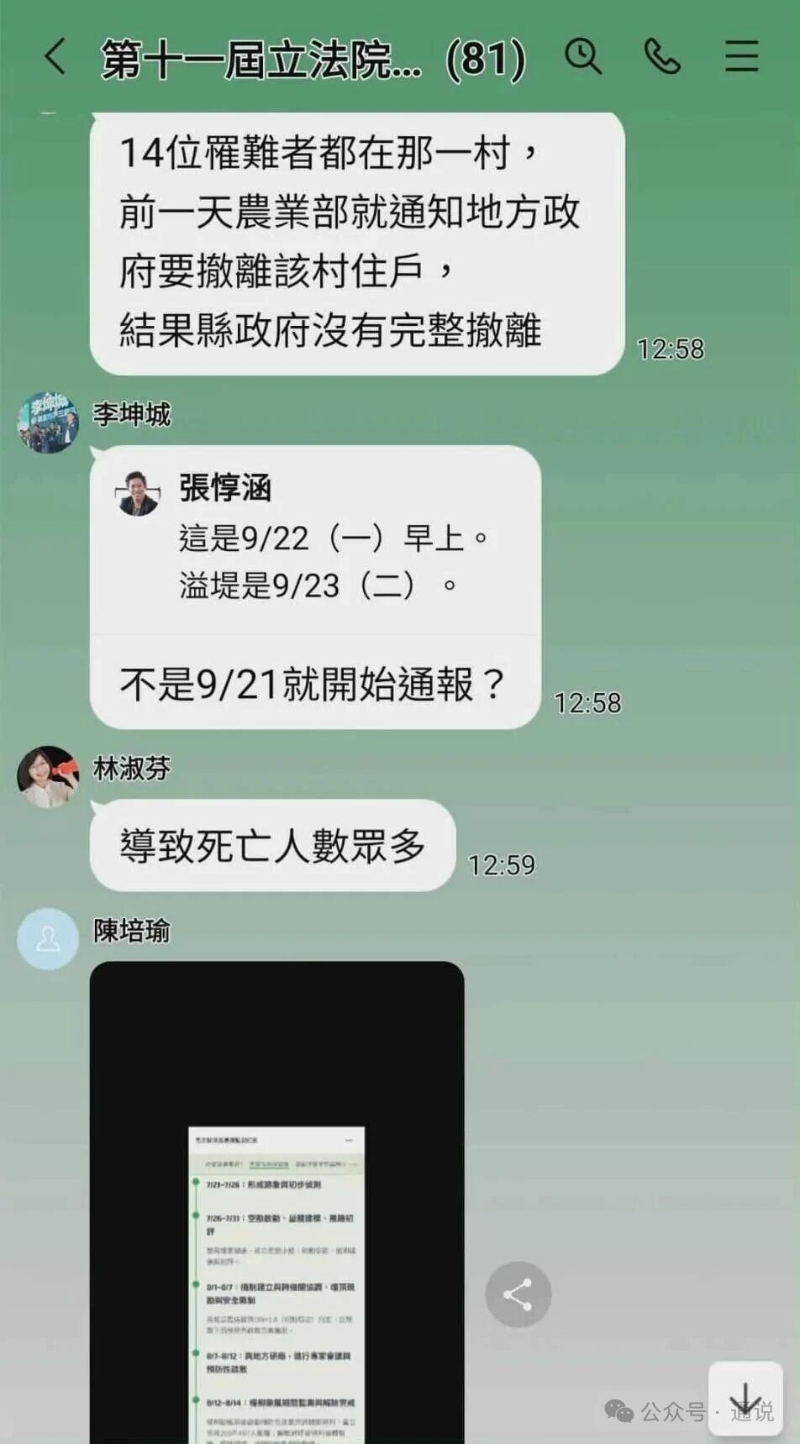 該處堰塞湖形成已有數月,潰堤後造成大批民眾生命財產受損不只是“天災”,也是“人禍”,預警、疏通、固堤、撤離等環節都可能存在紕漏,災害發生究竟由誰負責,也成為花蓮縣政府與台當局“行政院”扯皮之處。 24日在勘災現場,“行政院長”卓榮泰同花蓮縣立委傅崐萁因究責多次發生口角,面對傅崐萁連番指責“行政院”的各項失職,卓榮泰一怒之下拂袖離開前線指揮所,並聲稱“這樣的討論沒意義”。 卓榮泰在勘災中吃癟,眼見堰塞湖釀災要由“行政院”背黑鍋,民進黨政客們坐立難安,部分立委與“行政院”官員就在社交平台群組中討論“對策”。 令綠營政客意想不到的是,多為高層人員參加的群組竟有聊天截圖流出。被曝光的內容顯示,王定宇稱民進黨秘書長徐國勇建議通過媒體或第三方登出“殺傷力消息”,以利友軍、民進黨立委與政務人員接續反擊。