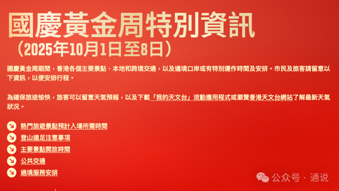 另外,香港旅發局的網站還準備了黃金周特別資訊,內含跨境交通的信息,包括跨境巴士的購票鏈接、口岸人流情況、公共交通服務時間(複製以下鏈接可直達):https://www.discoverhongkong.com/tc/plan/traveller-info/national-day-golden-week-special-information.html-services