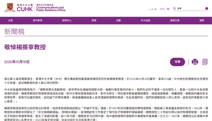 (香港中通社圖片) 巨星隕落,舉世震驚。過去的這些天裡,大家都在談論楊振寧,或因他卓越的物理學成就,或因他作為首位華人諾貝爾獎得主改寫了華人科學史,亦或因他那相差50歲的忘年戀曲……而在看似與他毫不相干的香港,他亦被人默默緬懷著。 楊振寧逝世三天后,在香港舉行的邵逸夫頒獎禮上,香港特首李家超在致詞時特別緬懷了他。他說,在慶祝新成就時,亦需向前輩致敬。楊教授作為最早獲得諾貝爾物理學獎的華人科學家之一,重塑了現代物理學,始終致力於中國科學和教育發展;他對知識的追求,以及為人類知識進步付出的不懈努力,至今仍被銘記。 楊振寧逝世五天后,香港中文大學將於大學圖書館內大學校史館設置吊唁室,供市民前往簽署吊唁册及留言,緬懷楊振寧的卓越貢獻。 楊振寧與香港的淵源,要追溯到1964年。 據港中大公開資料顯示,1957年楊振寧獲得諾貝爾物理學獎後,於1964年12月應邀在港中大作公開學術演講,長達一小時,場內滿座,場外數千人。在那之後,楊振寧與港中大建立了長達半個世紀的情誼,他經常到訪港中大,并擔任教研工作,曾擔任榮譽教授、博文講座教授、數學科學研究所所長、理論物理研究所所長等職,對大學的科研與教育發展貢獻卓著,并於1997年獲頒榮譽理學博士。 1999年,楊振寧將包括諾貝爾獎在內的許多獎項、文章、信札、手稿慷慨捐贈予港中大,大學於2002年設立了楊振寧學術資料館。