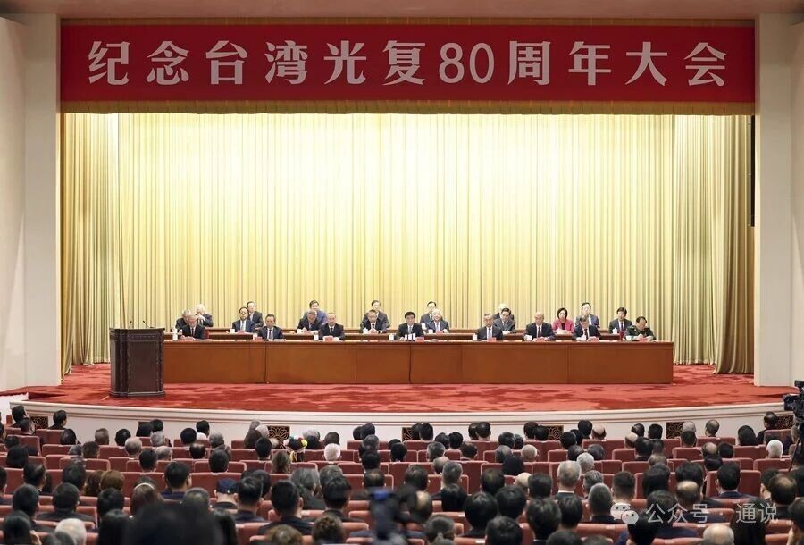 中國戰區台灣省受降儀式在台北公會堂舉行(中國人民抗日戰爭紀念館供圖) 80年後的10月25日,紀念台灣光復80周年大會在北京人民大會堂舉行。據了解,多位台商、台青代表出席,包括中國全國台企聯會長李政宏、台大哲學系教授苑舉正、銘傳大學公共事務系教授楊開煌、前立法委員邱毅、旺旺集團總經理蔡旺庭、前國民黨中央委員徐正文、台灣《觀察》雜誌發行人紀欣、勞動黨主席吳榮元、統一聯盟黨榮譽主席戚嘉林等。 25日中午,中共中央台辦、國務院台辦在釣魚台國賓館舉辦設立台灣光復紀念日招待會,參加紀念台灣光復80周年大會的台灣各界嘉賓、大陸有關方面代表人士出席。中共中央台辦、國務院台辦主任宋濤表示,設立台灣光復紀念日,是銘記歷史、緬懷先烈的重要舉措。