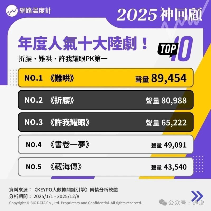 通說:這一年台灣人追陸劇 越追越上頭2025年這一年,“台獨”分子不斷在台灣島內製造各種分裂活動,“以武謀獨”、“倚外謀獨”、渲染“抗中保台”、千方百計阻隔兩岸交流等等,花樣百出,兩岸關係也因此持續緊張、冷峙。 也是這一年,台灣前領導人馬英九率數十位青年才俊赴大陸參訪,足跡從東南的福建跨到西北的甘肅。網紅“館長”陳之漢大陸行更是成癮,一年很多趟,趟趟掀起熱潮。在視頻號等平台上,各種台灣青年大陸體驗之旅,已是屢見不鮮。 還在島內的許多台灣人,也不被民進黨當局的恐嚇所嚇到,淘寶網店陸貨照購,音影平台陸劇照追,越購越來勁,越追越上頭。 臨近年末,各行業都在進行年終盤點。12月17日,台灣網絡熱門話題分析網站“網絡溫度計”通過“KEYPO大數據關鍵引擎”輿情分析軟件,盤點出今年十大人氣陸劇。時間範圍是2025年1月1日至2025年12月8日。該網站是全台最大數據分析平台,數據庫涵蓋台灣大部分的網絡新聞頻道、社媒平台、網絡論壇及部落格等網站資料。
