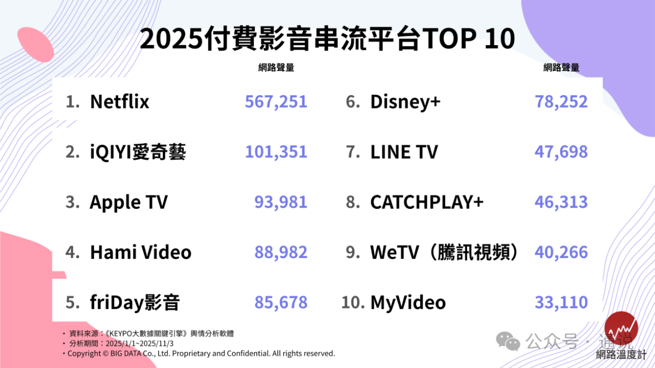 值得一提的是,10月中,聚焦台灣隱蔽戰線鬥爭的電視劇《沉默的榮耀》引發島內廣泛關注,多家台灣媒體密集報道,台灣網友在電視劇片段下熱情分享他們的追劇心得,更有不少台灣民眾自發到台北馬場町紀念公園,擺上祭品、鞠躬致哀,悼念當年在此地犧牲的吳石、朱楓、陳寶倉、聶曦等烈士。 陸劇的熱播也成功帶動了大陸影音平台在台的發展。台灣“網絡溫度計 DailyView”經網絡社群數據庫分析整理了2025年1月1日至11月3日的數據發布了“台灣2025年十大付費串流平台聲量榜”榜單。其中,愛奇藝、WeTV(騰訊視頻)兩個大陸影音平台成功登榜,分別排名第二和第九。值得一提的是,在榜單排名第六和第七的Disney+和LINE TV,也有大陸劇的一份功勞。Disney+今年最吸睛的莫過於大陸古裝大戲《藏海傳》,5月上線就吸引大批粉絲收看,連續7天穩居“台灣本日熱播TOP 10”冠軍。而在LINE TV播出的大陸劇《國色芳華》也引爆劇迷討論熱潮。