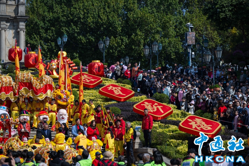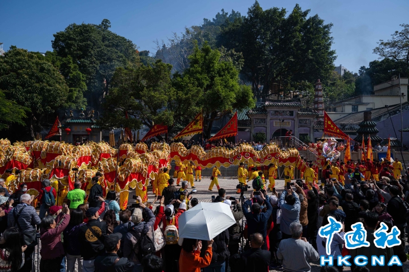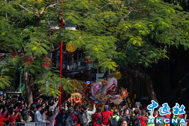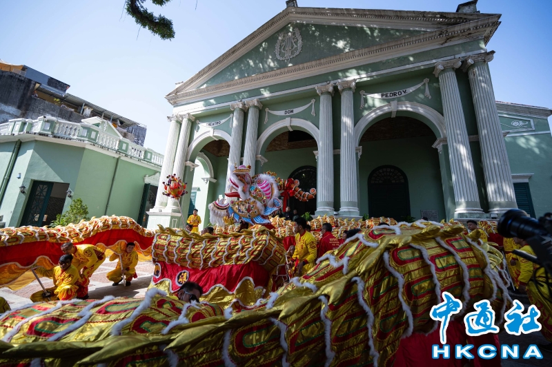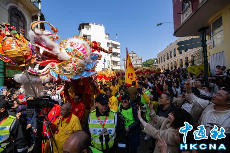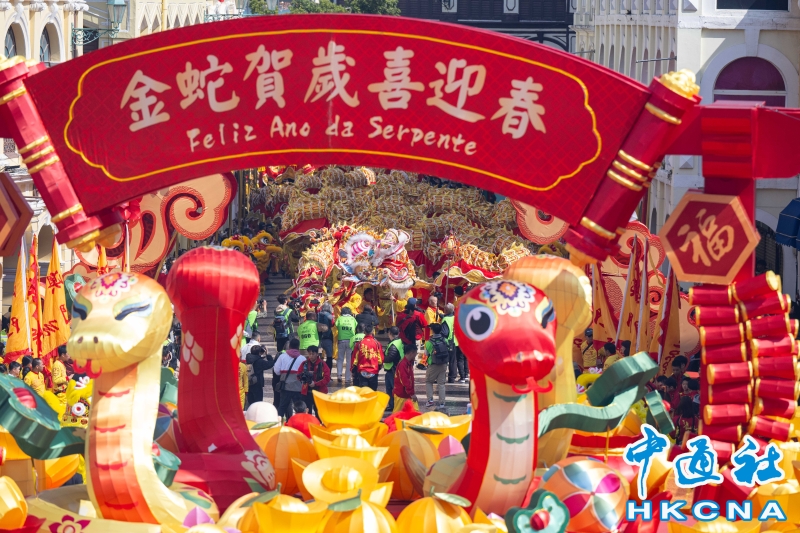 •   1月29日,澳門旅遊局上午11時在大三巴牌坊及議事亭前地舉辦“歡樂春節——2025年龍騰舞躍賀新春”社區巡演活動,與澳門居民和旅客歡度春節。 “歡樂春節——2025年龍騰舞躍賀新春”社區巡演活動安排238米長的大金龍及18頭醒獅,聯同財神、福祿壽三星、蛇生肖、金童玉女及澳門旅遊吉祥物“麥麥”向澳門居民和旅客拜年及派送金元寶。在巡遊隊伍的帶領下,嘉賓們由大三巴牌坊到達議事亭前地燃放炮竹,寓意“炮竹一聲除舊歲”,揭開一連兩日巡演活動的序幕。香港中通社圖片