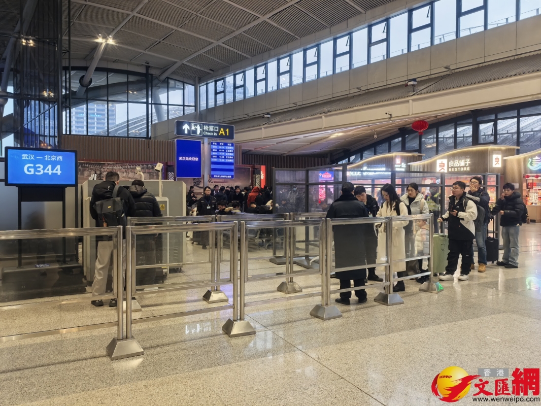 在武漢站看到,車站對進京方向列車還設置了二次安檢口。香港文匯網記者張帥攝 近日不少內地車站發出提醒,二次安檢期間,旅客應至少提前1小時進站候車,以免耽誤出行。同時,期間車站可能會採取限流措施,請旅客聽從工作人員引導,而對於拒不配合安檢或擾亂安檢秩序的人員,將依法依規交由相關部門處理。