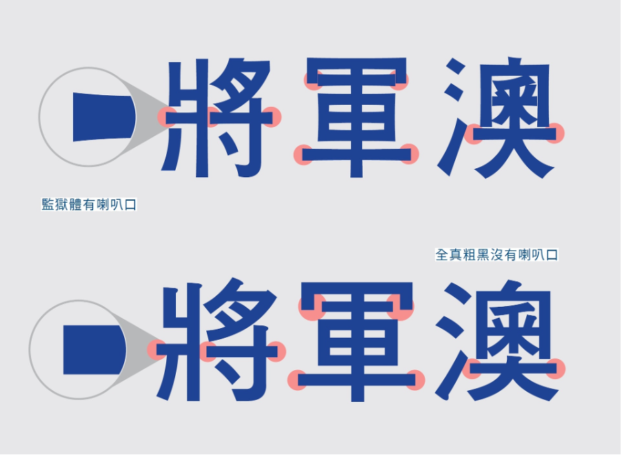 “監獄體”採用“喇叭口”設計,即在筆劃開端放大,形成喇叭形狀,令字體更醒目。(圖源:《香港道路探索增訂版》)