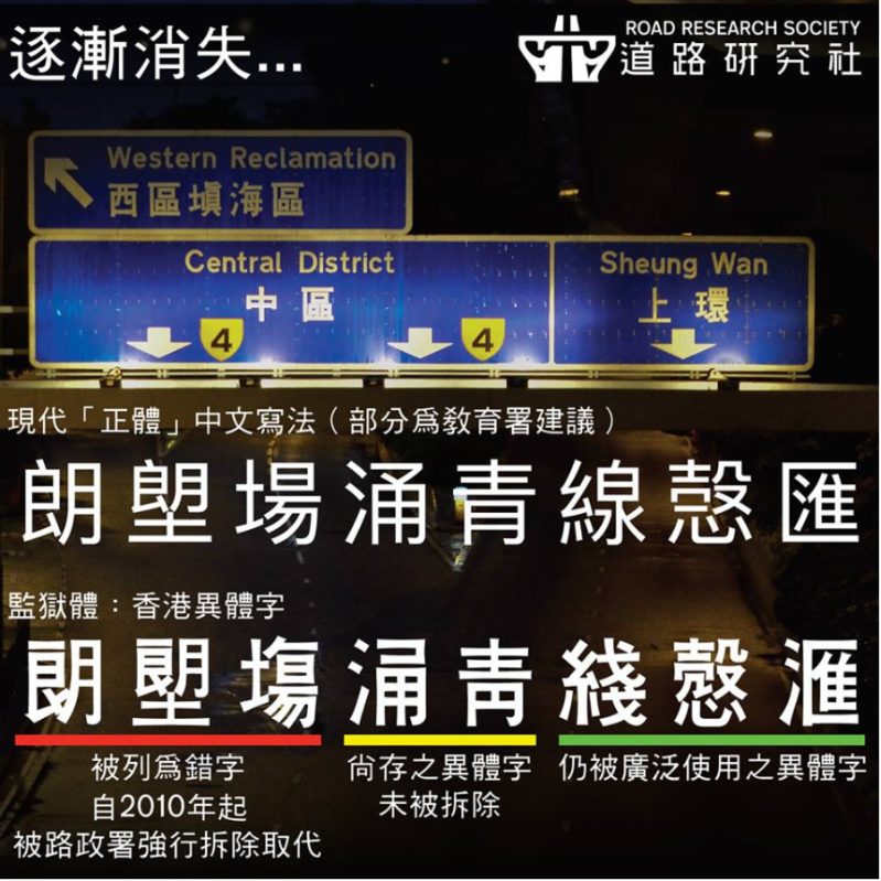 “監獄體”採用了俗稱異體字的印刷體,例如馬場的“場”,寫作“塲”;東涌的“涌”、青衣的“青”和元朗的“朗”字等,亦和電腦字體所用的楷書寫法有出入。(圖源:道路研究社)