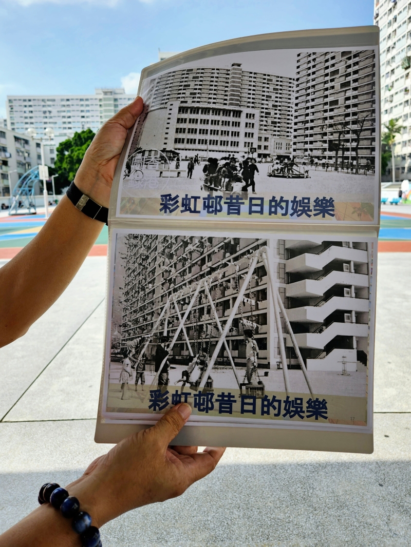 湛Sir展示彩虹邨昔日的娛樂設施。(香港中通社記者 黃璇攝) “貼地”的購物天堂 當年的小販攤檔看似雜亂無章,其實攤販們心中皆暗有默契。湛Sir憶述,70年代時,每天傍晚五六點,小販便會從各處趕至彩虹邨,有條不紊地在彼此默認的位置擺賣。當中以金碧茶樓酒家外的兩段行人路最興旺,木頭車和地攤沿騎樓底展開,擺賣各類生活用品、服飾、乾貨等,連馬路上也擺滿攤檔,貨品琳瑯滿目,儼如小型夜市,好不熱鬧。隨天色漸暗,小販攤檔陸續退場,又到粥檔、雲吞麵檔等宵夜熟食小販陸續登場,一直營業至晚上11點左右才結束,屋邨方回復寧靜。 湛Sir還讓我留意,原來屋邨內的每一層樓,都有一排連著6個窗的“單位”,其實是讓街坊聯誼乘涼的空間,類似《富貴逼人》中,“驃嬸”沈殿霞和街坊打麻雀之處。不過,這裡就不似電影中所演,“打麻雀賭博是不允許的,電影終歸是電影啦。這裡是因為當年搬來的居民多來自徙置區,居住環境比較迫。政府就體恤民情,每層都空出一個單位締造此聯誼空間,讓街坊聊天或吃點東西。”而湛Sir小時候就最喜歡在這裡和同齡孩子踢“西瓜波”。