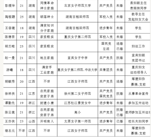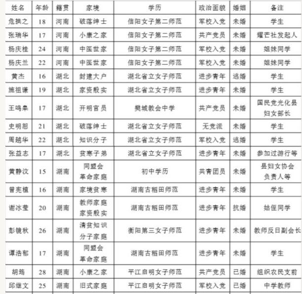 1927年3月5日,黃埔女生大隊(第一屆女兵)拍下了這張具有歷史意義的照片,這也是她們唯一一次集體亮相。 參加黃埔女兵的都是哪些人? 1926年,正是中國在追求婦女解放,男女平等的潮流盛起的時候,女兵們以一種看似極端的方式,展露出“男人能做的事情,女人也能做到”的豪情。 這些女兵同學之中有母女關係、姐妹關係、甚至姑嫂關係。未婚者佔多數,也有的已婚甚至有子。後來著名的紅軍女將、烈士胡筠,當時就是軍校裡已有孩子的女兵之一。為了革命,她決然選擇暫時拋開家庭和親人。後來從事地下黨工作和領導山西臨汾抗日救亡運動的王亦俠則是抱著孩子去投考。女兵中有逃婚和抗婚經歷的隊員特別多。下表為當年黃埔軍校女生隊部分學員簡介。