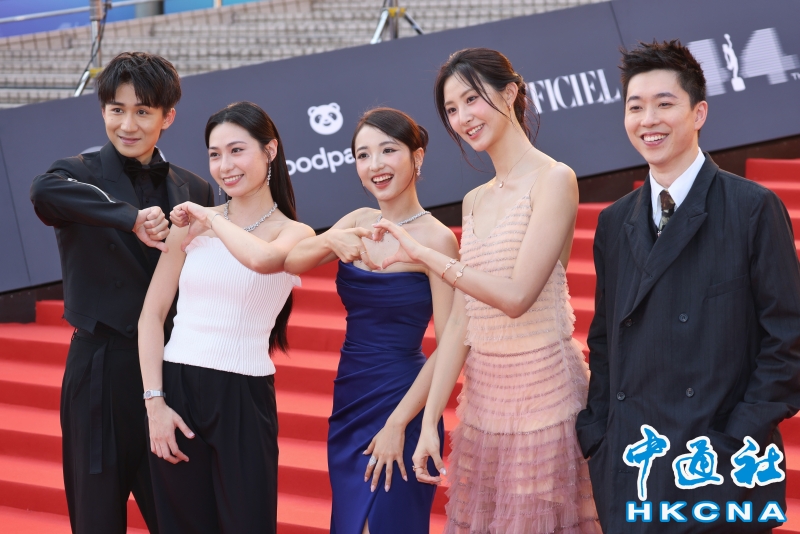 •   4月19日,香港影壇盛事“第44屆香港電影金像獎”頒獎禮在香港文化中心舉行。一眾演員從尖沙咀海濱長廊踏上紅地氈,以最靚姿態示人。圖為金像獎平台直播主持人吳肇軒、蔡蕙琪、趙君瑜、Ka.Lin連花、筆華棋率先亮相紅地毯。 (香港中通社記者  謝光磊 攝) 香港中通社圖片