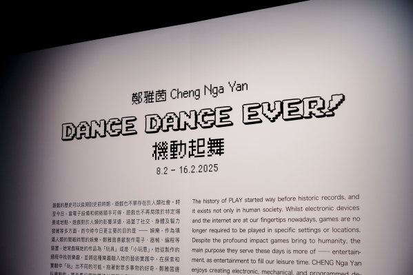 “機動起舞”展覽的創作靈感來自跳舞遊戲,鄭雅茵通過展覽與表演探索舞蹈動作與數位互動的可能性。展覽中的一系列互動裝置設有不同的介面和感應方式,邀請觀眾以玩家或旁觀者的身份參與其中;而表演則進一步探討了遊戲的表演性,舞者與互動裝置進行現場展示,挑戰裝置的機制或表演的狀態,從而延伸觀眾對舞蹈和遊戲的想像。