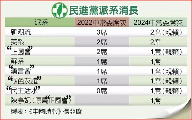 民進黨這一屆將卸任的中常委派系分布,分別為“新潮流”3席、“英系”2席、“正國會”2席,“蘇系” 1席、“湧言會”1席、“綠色友誼”1席。
