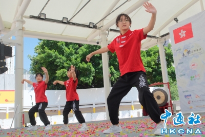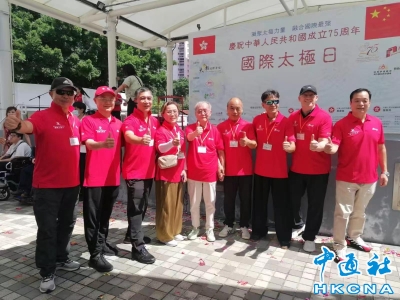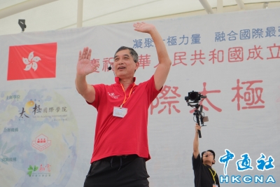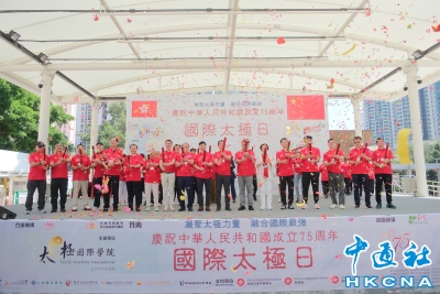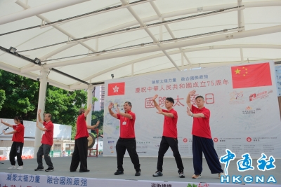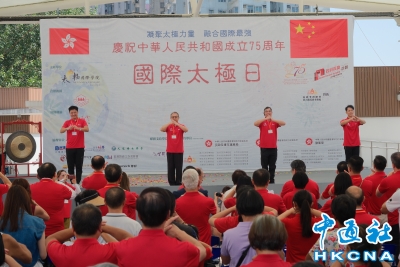 10月12日,香港太極國際學院在黃大仙廣場舉辦國際太極日,並慶祝中華人民共和國成立75周年。大會邀請到太极拳名师施雄鵬、澳洲國際氣功太極學院巫朝暉主席、北美武苑余燊、美國脊醫Dr Bellin David、吳氏太極傳人單穎、徐鈿英、趙雷、洪礎焺師傅等現場分享和展演太極拳魅力。今年活動主題是“凝聚太極力量,融合國際最強”。(香港中通社記者許其皓攝) 香港中通社圖片