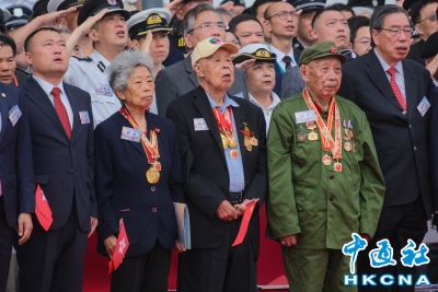 5月4日早晨,為紀念五四運動106周年及中國人民抗日戰爭暨世界反法西斯戰爭勝利80周年,香港各界青少年活動委員會於金紫荊廣場舉行升旗禮。圖為東江縱隊香港地區抗日遊擊隊老戰士林珍(左二)、羅競輝(左三)、梁平(右二)出席升旗禮。(香港中通社記者 許其皓攝) 香港中通社圖片