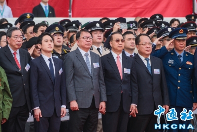 5月4日早晨,為紀念五四運動106周年及中國人民抗日戰爭暨世界反法西斯戰爭勝利80周年,香港各界青少年活動委員會於金紫荊廣場舉行升旗禮。圖為香港特區政府政務司司長陳國基(左三)、香港中聯辦副主任劉光源(右三)、外交部駐港特派員公署副特派員潘雲東(右二)等出席升旗禮。(香港中通社記者 許其皓攝) 香港中通社圖片