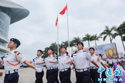 5月4日早晨,為紀念五四運動106周年及中國人民抗日戰爭暨世界反法西斯戰爭勝利80周年,香港各界青少年活動委員會於金紫荊廣場舉行升旗禮。圖為護旗方隊入場。(香港中通社記者 許其皓攝) 香港中通社圖片