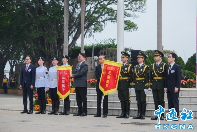 5月4日早晨,為紀念五四運動106周年及中國人民抗日戰爭暨世界反法西斯戰爭勝利80周年,香港各界青少年活動委員會於金紫荊廣場舉行升旗禮。圖為香港特區政府政務司司長陳國基(左五)、香港中聯辦副主任劉光源(右五)為護旗方隊成員頒發五四旗手榮譽錦旗。(香港中通社記者 許其皓攝) 香港中通社圖片