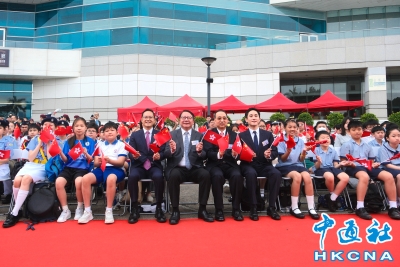 5月4日早晨,為紀念五四運動106周年及中國人民抗日戰爭暨世界反法西斯戰爭勝利80周年,香港各界青少年活動委員會於金紫荊廣場舉行升旗禮。圖為香港特區政府政務司司長陳國基(左二)、香港中聯辦副主任劉光源(右二)等與青少年合照。(香港中通社記者 許其皓攝) 香港中通社圖片