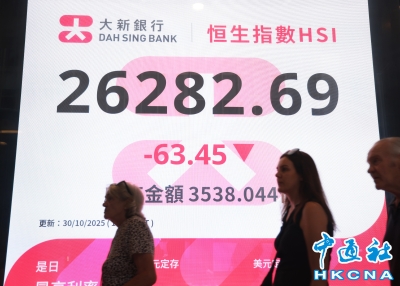 10月30日,截止收盤,香港恒生指數跌63.45點,跌0.24%,報26282.69點,主板全日成交3538.04億港元。(香港中通社記者 鄧梓傑 攝) 香港中通社圖片