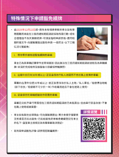 個別車主如有實際困難而未能在三個月通知期屆滿前採取所需行動,或有合理理由不為其車輛領牌,可向運輸署申請豁免。一般而言,可獲豁免的車輛包括:(一)等待零件維修送驗後續牌的車輛;(二)車齡30年或以上、正妥善保存作私人收藏而不會在路上使用的車輛;或(三)妥善保存於車輛經銷商作寄賣的車輛。申請豁免的資格、指引、申請表及所需文件詳見。署方會視乎個案情況考慮是否批准申請。