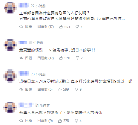 “逾7成日本民眾反對出兵保台”的消息傳到台灣,島內網友紛紛表示不意外,指台灣人自己都不想當兵,只有台灣某些政客自我感覺良好,覺得別國會出兵幫忙打仗,“正常都會問為什麼要幫別人打仗啊?”