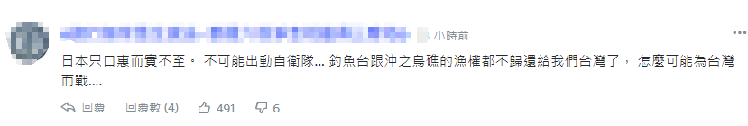 還有台灣網友指出,日本公然宣稱“擁有釣魚島”、主張沖之鳥礁周邊海域是日本“專屬經濟海域”,怎麼可能為台灣而戰……