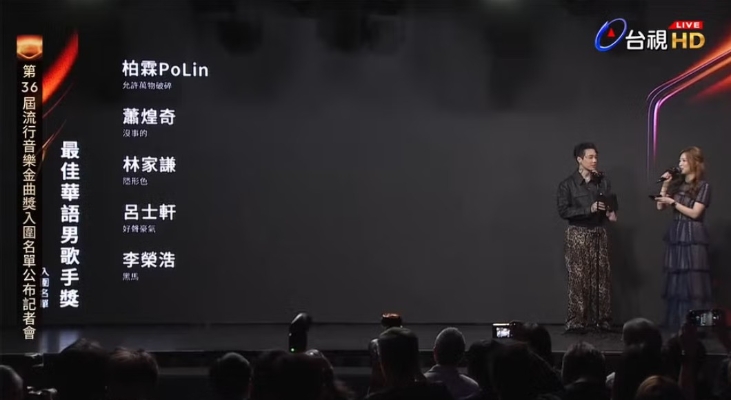 最佳華語男歌手獎入圍名單。(直播截圖)
