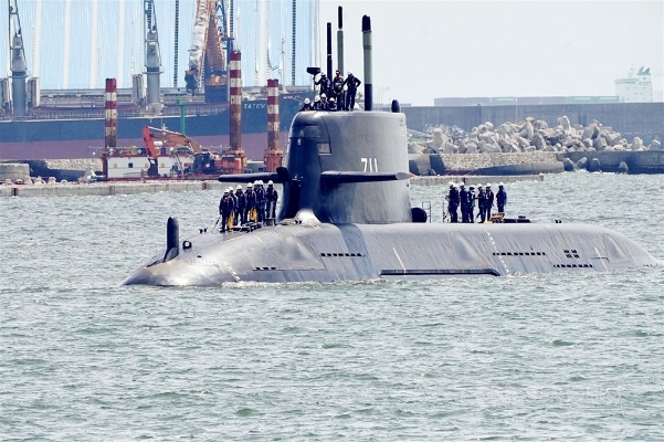圖為台灣製造的潛艦原型艦“海鯤”號駛出高雄港進行第一次海上測試。台灣“中央社”資料圖