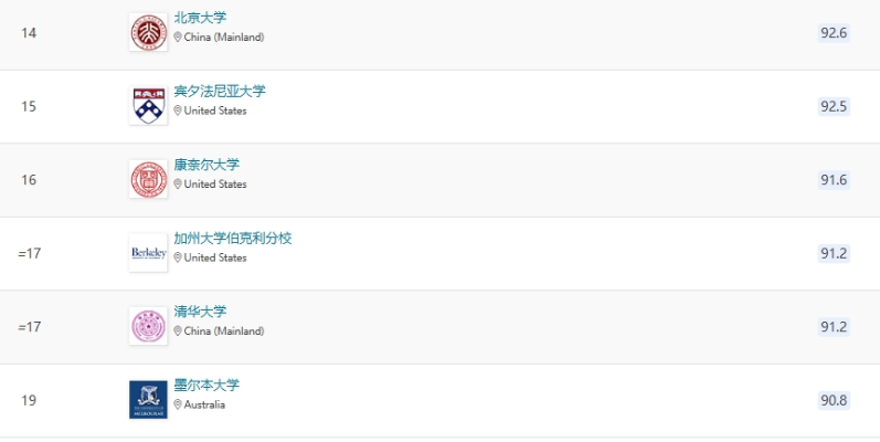 北京大學和清華大學躋身全球前20,北京大學排名維持在全球第14名,清華大學相較去年上升3位,位列全球第17名。全球前100的中國內地高校還有復旦大學(第30名)、上海交通大學(第47名)和浙江大學(第49名)。