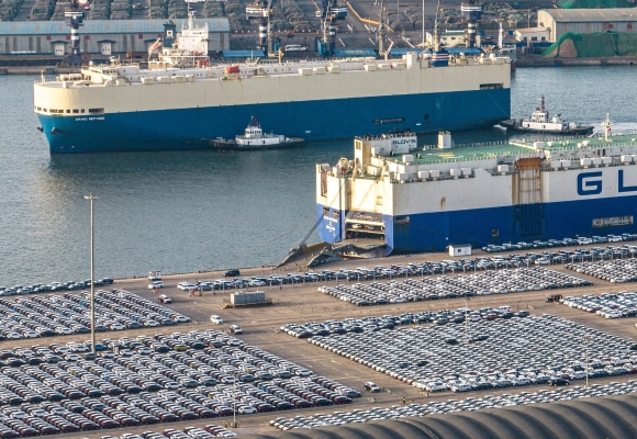 資料圖為2023年3月17日拍攝的煙台港外貿商品車“出海”場景。香港中通社圖片