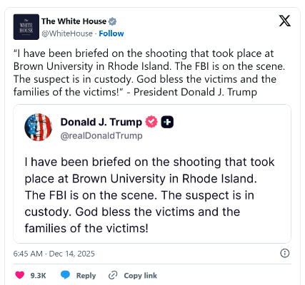 香港新聞網12月14日電 美國當地時間周六(13日)下午4時左右,位於美國羅得島州普羅維登斯市的布朗大學驚傳槍案,一名黑衣槍手闖入學校,在工程學院槍擊至少11人,造成2人死亡,9人送醫救治。總統特朗普就槍擊事件作出回應。
