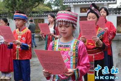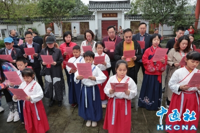 4月1日,參加2023年海外華文媒體“八桂僑鄉行”活動的30余家海外華文媒體代表前往廣西玉林市中華優秀傳統文化展示基地參訪。該基地是集文化教育、體驗、交流於一體的綜合性平台,展示內容有國家方略、領袖論述、玉林賢哲、詩詞精粹、傳統藝術、僑鄉文化等相關主題。圖為海外華文媒體代表與當地學生團體一起誦讀《詩經》、《論語》。(香港中通社記者 謝光磊 攝) 香港中通社圖片