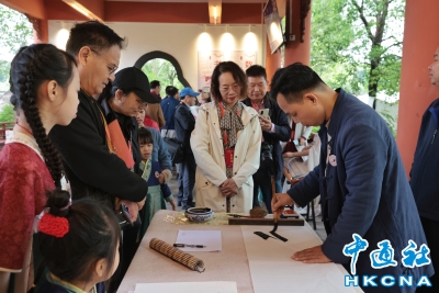 4月1日,參加2023年海外華文媒體“八桂僑鄉行”活動的30余家海外華文媒體代表前往廣西玉林市中華優秀傳統文化展示基地參訪。該基地是集文化教育、體驗、交流於一體的綜合性平台,展示內容有國家方略、領袖論述、玉林賢哲、詩詞精粹、傳統藝術、僑鄉文化等相關主題。圖為海外華文媒體代表親身體驗書法、國畫、射箭等中華傳統文化。(香港中通社記者 謝光磊 攝) 香港中通社圖片