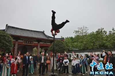 4月1日,參加2023年海外華文媒體“八桂僑鄉行”活動的30余家海外華文媒體代表前往廣西玉林市中華優秀傳統文化展示基地參訪。該基地是集文化教育、體驗、交流於一體的綜合性平台,展示內容有國家方略、領袖論述、玉林賢哲、詩詞精粹、傳統藝術、僑鄉文化等相關主題。圖為海外華文媒體代表欣賞非遺雜技表演。(香港中通社記者 謝光磊 攝) 香港中通社圖片