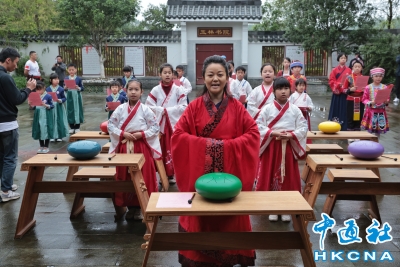 4月1日,參加2023年海外華文媒體“八桂僑鄉行”活動的30余家海外華文媒體代表前往廣西玉林市中華優秀傳統文化展示基地參訪。該基地是集文化教育、體驗、交流於一體的綜合性平台,展示內容有國家方略、領袖論述、玉林賢哲、詩詞精粹、傳統藝術、僑鄉文化等相關主題。圖為海外華文媒體代表觀看當地學生團體誦讀《詩經》、《論語》。(香港中通社記者 謝光磊 攝) 香港中通社圖片