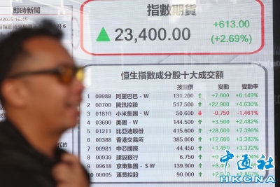 5月12日,中美貿易談判達成重要共識,大幅暫緩4月後關稅執行,港股一度飆升逾800點,創逾一個月高位。恆生指數收市報23549點,升681點。港股科網股大漲,十大成交額股份顯示,京東集團漲6.39%,阿里巴巴漲6.15%,騰訊控股漲4.63%。(香港中通社記者 謝光磊 攝) 香港中通社圖片