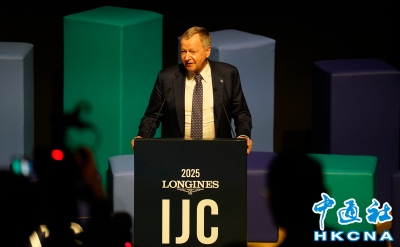 2025年浪琴國際騎師錦標賽將於12月10日在跑馬地馬場舉行。12月9日,12位參輿錦標賽的國際及本地騎師出席於大館舉行的媒體招待會,分享賽前準備與感受。圖為馬會行政總裁應家柏致辭。(香港中通社 陳奕啟 攝) 香港中通社圖片
