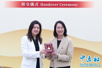 2月26日,“中國人民抗日戰爭勝利80週年紀念章”移交儀式在香港抗戰及海防博物館舉行。儀式由國務院港澳辦公室五局副局長李麗(左)代表中央政府贈送,香港康樂及文化事務署署長陳詠雯代表特區政府接受,並於博物館專題展覽廳公開展出。(香港中通社記者 鄧梓傑 攝) 香港中通社圖片