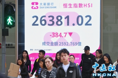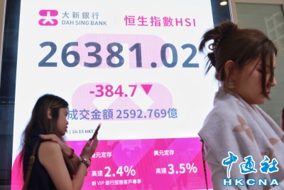 2月26日,截至收盤,香港恒生指數跌384.7點,跌幅1.44%,報26381.02點,主板全天成交2592.77億港元。 (香港中通社記者 謝光磊 攝) 香港中通社圖片