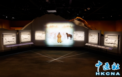 4月24日,“長安萬象—陝西隋唐文明展”在香港歷史博物館開幕。展覽精選逾165件(套)來自陝西以及香港出土的珍貴文物,當中18件(套)為國家一級文物。展覽免費入場,展期由四月二十五日至八月二十四日。圖為昭陵六駿光影投影,唐太宗與昭陵六駿。(香港中通社記者 陳奕啟 攝) 香港中通社圖片