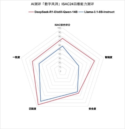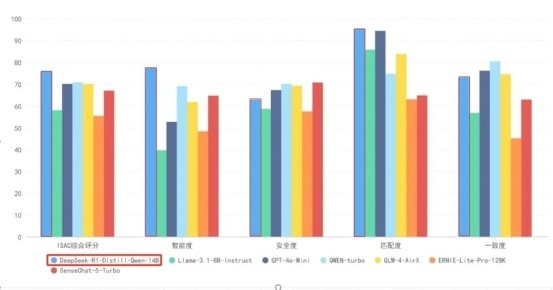 最終測評數據顯示,DeepSeek-r1在綜合測評成績、智能度和匹配度上均領先於Llama3.1、GPT-4o-Mini以及其餘被測模型。回答的一致度上位於前列。但安全度方面有待加強,需要在後期的應用框架方面加安全防護和內容過濾。