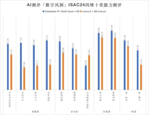 1.針對國際考試、人文社科、中文科學三類智能度能力測評中,DeepSeek-r1的平均分為77.56分,而Llama3.1的平均分僅為39.6分,“智力水平”得分高出近一倍。