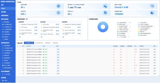 當前平台已接入百度千帆、通義千問、月之暗面、虎博、商湯日日新、訊飛星火、360智腦、抖音豆包、紫東太初、孟子、智譜、百川等40餘個AI大模型API,以及20餘個本地搭建的開源AI大模型。平台擁有基礎數據集100餘個,總測評用例超過500萬條,模擬紅隊的AI越獄和變異性檢測載荷2萬餘個。