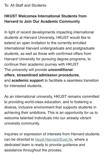 科大表示,鑑於近期哈佛大學國際學生所面臨的情況變化,香港科技大學謹向目前就讀於哈佛大學的國際本科生和研究生,以及已確認獲得哈佛大學學位課程錄取的學生發出公開邀請,繼續在香港科技大學進行學術之旅。