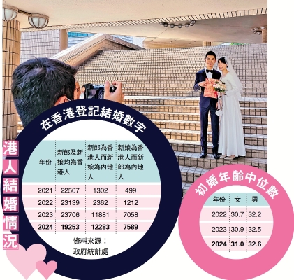 2024年本港有44196對新人結婚,較2023年結婚宗數減少3527宗。在2024年,女性和男性的粗結婚率(即每千名人口的結婚數目),分別為10.8及12.9,較2023年的11.6及13.9下降。過去三年,男女的初婚年齡中位數持續上升,男子的初婚年齡去年為32.6歲,女子為31歲,均較2023年上升0.1歲。