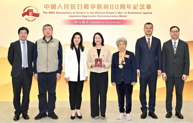 儀式上,國務院港澳事務辦公室五局副局長李麗代表中央政府贈送紀念章,由康樂及文化事務署署長陳詠雯代表特區政府接受。陳詠雯致辭時感謝中央政府的饋贈,讓香港市民能有機會欣賞紀念章及體會其深厚意義,增強愛國情懷。紀念章27日起在香港抗戰及海防博物館的“風雨同舟共建和平——粵港人民抗戰勝利八十周年展”專題展覽展出。